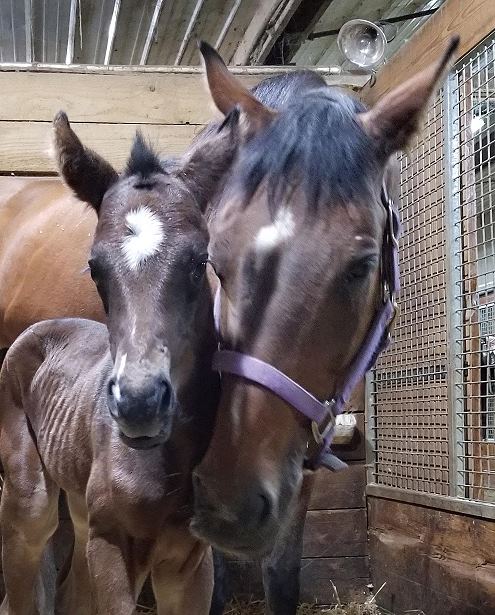 On April 25, 2018, Corky delivered a large bay filly - the delivery was textbook! At first Corky rejected her alien baby, they spent the night separated in two different stalls and by morning her maternal instincts kicked in and she was depserate to get with her baby. After that, all went perfectly between the two of them.